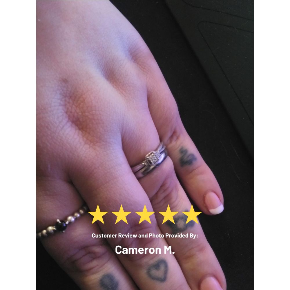 - Free ring sizerPlastic finger-sizer posted out first — nail the fit before we cut.